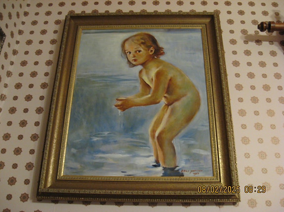Kehystetty Maalaus Lapsi Vesileikissä. Eeli Jaatisen käsialaa v. 1967