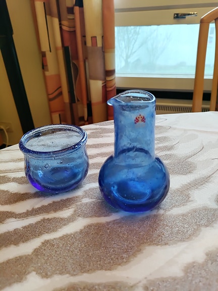 Studiolasin kermakko ja sokerikko . Sininen lasi