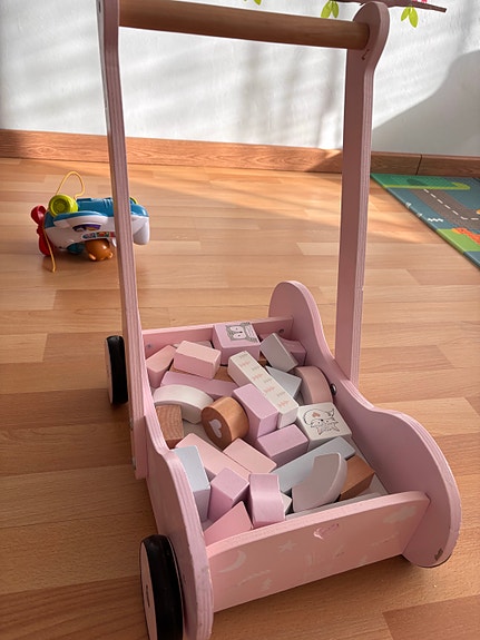 Lidlin puinen kävelyvaunu palikoilla vaaleanpunainen