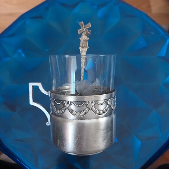 Mukinpidike-hopeoitu,lasilla ja lusikalla