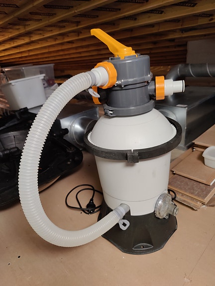 Uima-allas hiekkasuodattimella ja lämpöpumpulla.