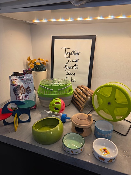 Pieneläintarvikkeet; hamstereille, juoksupyörä, kuljetusboksi, kupit, juomapullo