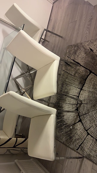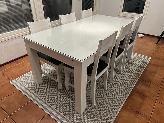lasi ruokapöytä sekä valkoiset nahka tuolit