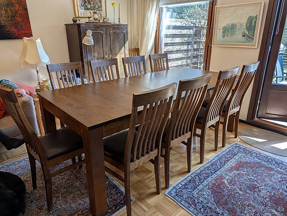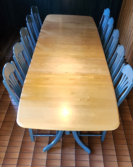 Jatkettava iso ruokailuryhmä 180-315cm sekä 10kpl ruokapöydäntuoleja. Kotimainen