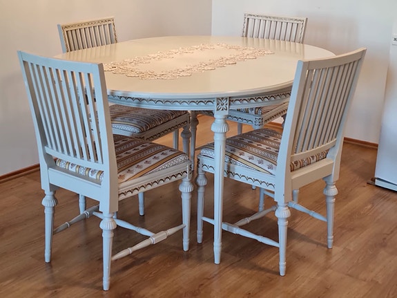 Upea Kustavilainen ruokailuryhmä (jatkettava pöytä + 4 tuolia)