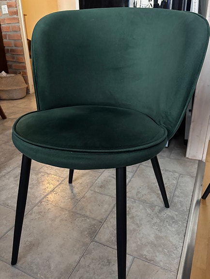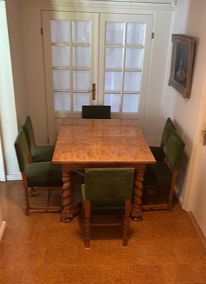 Pöytäryhmä, pöytä ja 6 vihreällä sametilla verhoiltua tuolia