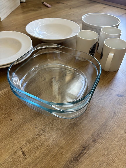 IKEAn lasivuokia, valkoisia mukeja CASAn lautasia