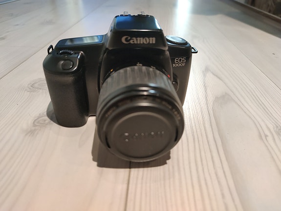 Canon EOS 1000F filmijärkkäri, pari objektiivia, salama ja tarvikkeita