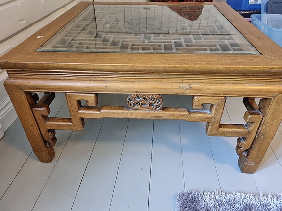 Kiinalainen sohvapöytä lasikannella ja koristeellisella kaiverruksella