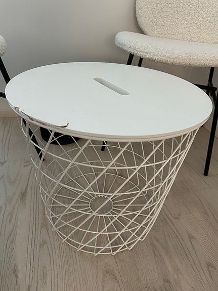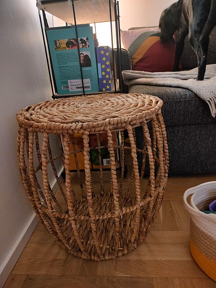 Uudenveroinen punottu kori/pöytä, jossa säilytystilaa