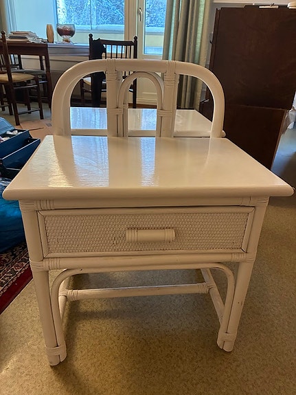 2 kpl valkoisia rottinkisia yöpöytiä/lipastoja