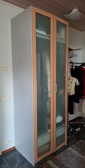 Vaatekaappi lasiovilla ja puureunuksilla