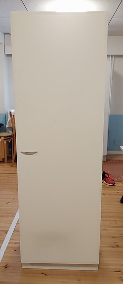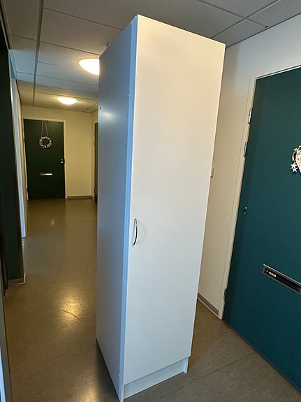Valkoinen korkea kaappi hyllyillä