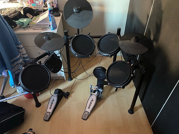 Alesis Turbo Mesh -sähkörummut pedaaleilla ja Pearl-rumpujakkara