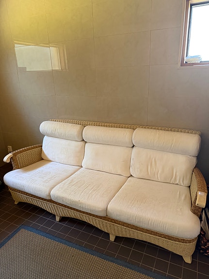 Rottingisohva ja nojatuolit vaaleilla kangasverhoiluilla