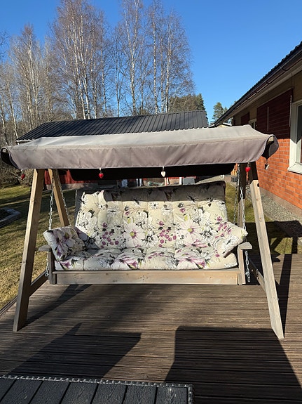 Puutarhakeinu katoksella ja kukkakuosisilla istuintyynyillä