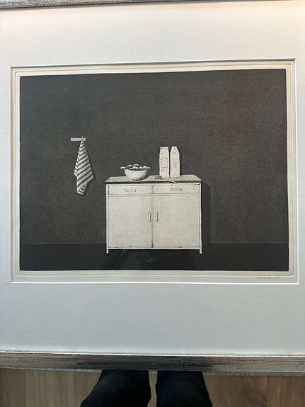 Pentti Kaskipuro grafiikka keittiöaiheinen taidevedos mustavalkoinen