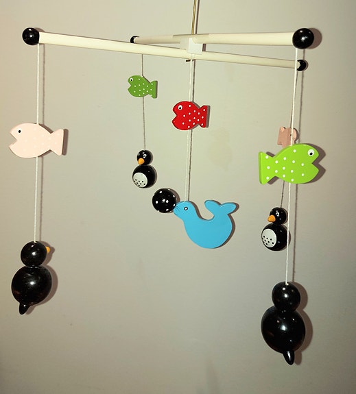 Puinen vauvan mobile, pingviini/meri aiheinen