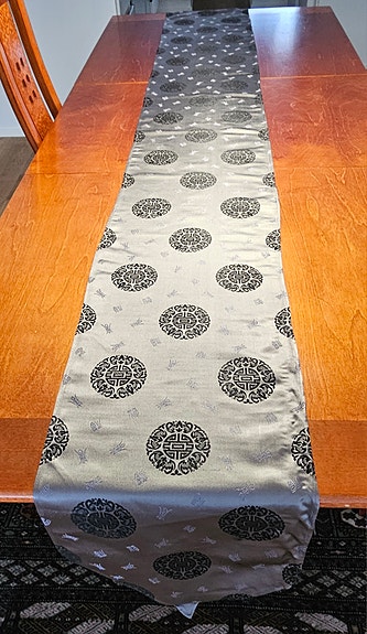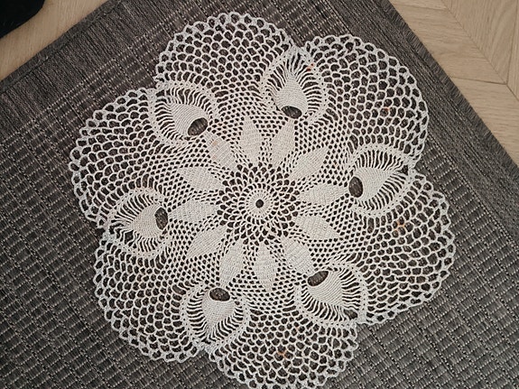 Käsin virkattu hopean värinen pitsi liina,,42 cm tahraa