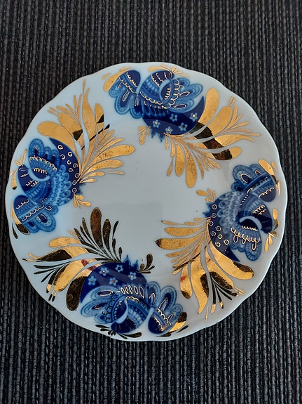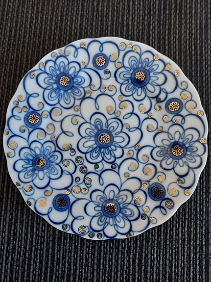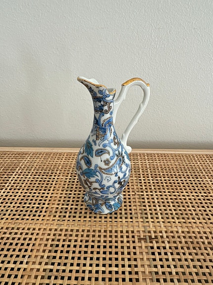 Pieni sinivalkoinen posliinikannu kultakoristein