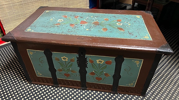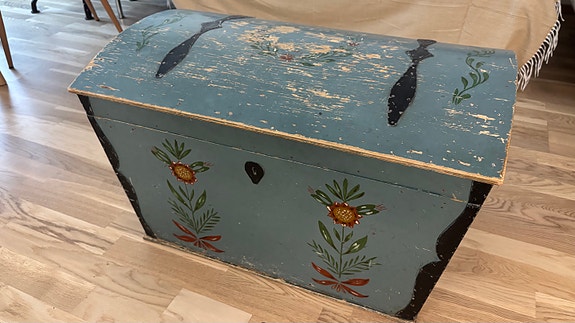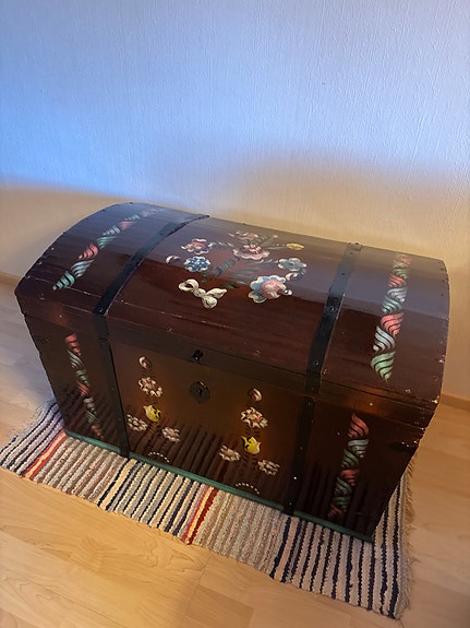 Puinen arkku käsinmaalatuilla kukkakoristeilla