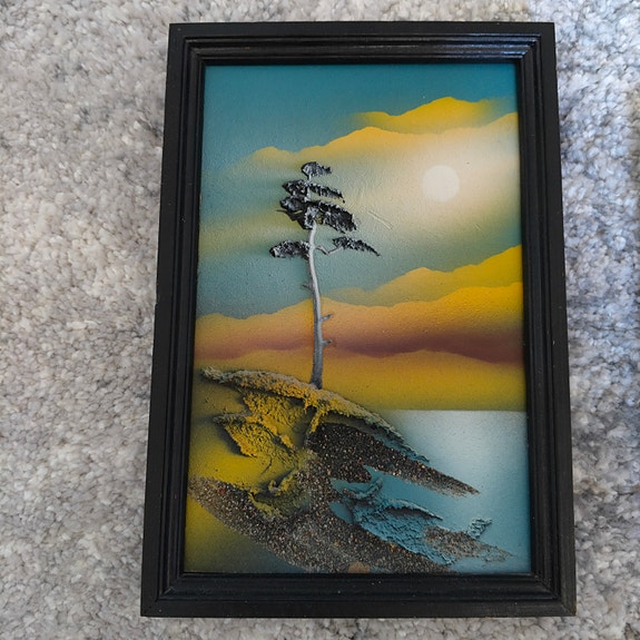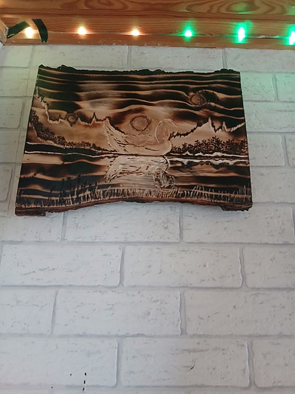 Puinen polttokuvioitu taulu maisema- ja eläinaiheella
