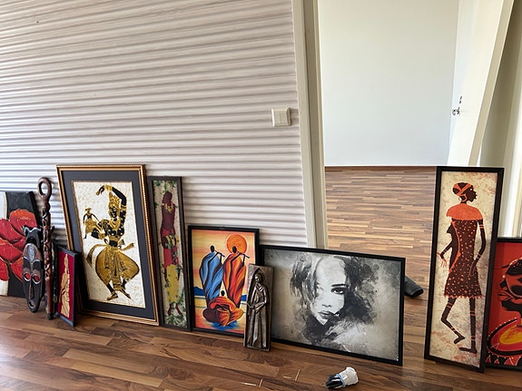 Kuvataidekokoelma kehystetyt taulut ja puuesineet