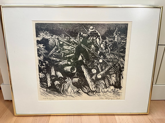 Toimi Kiviharju - "Tukkiruuhkalla" puupiirros kehystetty