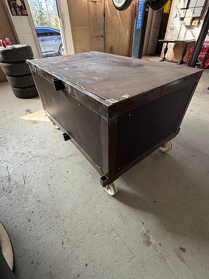 Metallinen työpöytä säilytyskaapilla ja pyörillä