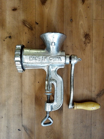 Metallinen käsikäyttöinen lihamylly puukahvalla
