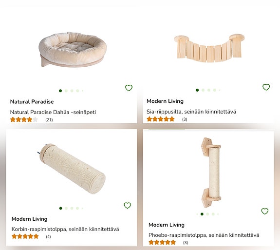 Kissanpedit, vessat, kiipeilypuut ja raapimatolpat sekä muut tavarat kissoille voi hyvin ostaa käytettynä. Torissa on 2 556 ilmoitusta, joissa myydään ja ostetaan kissatarvikkeita.
