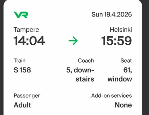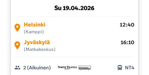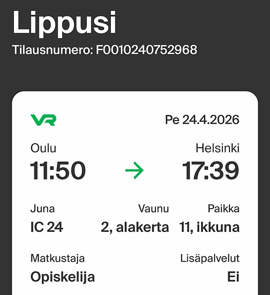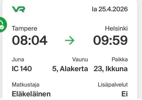 15 €Junalippu Tampere–Helsinki 19.4.2026Helsinki, Taka-Töölö, Uusimaa16.4.Lisää suosikiksi.Avaa ilmoitus