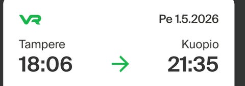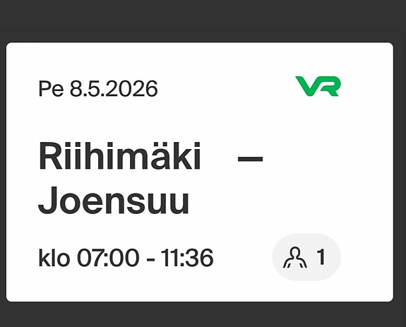 12 €Junalippu Tampere-Kuopio 1.5.2026Kuopio, Etu-Niirala, Pohjois-Savo14.4.Lisää suosikiksi.Avaa ilmoitus
