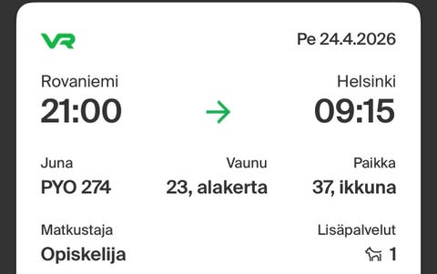 42 €VR junalippu Oulu–Turku 17.6.2026Oulu, Kaukovainio, Pohjois-Pohjanmaa15.4.Lisää suosikiksi.Avaa ilmoitus
