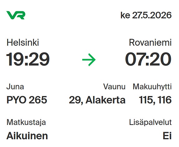 60 €Yöjunahytit Helsinki-Rovaniemi-Helsinki, 60 €/suuntaHelsinki, Puistola, Uusimaa7 pvLisää suosikiksi.Avaa ilmoitus