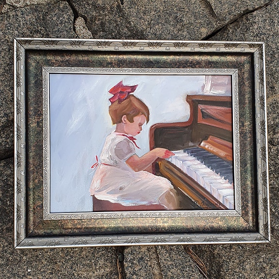 Öljyvärimaalaus tyttö pianon ääressä