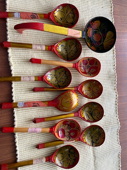 Neuvostoliiton aikaiset puiset maalatut lusikat ja kauha