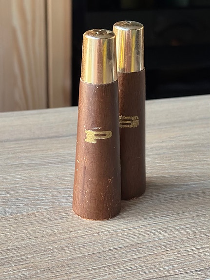 Vintage puinen suola- ja pippurisetti ruskea/kulta