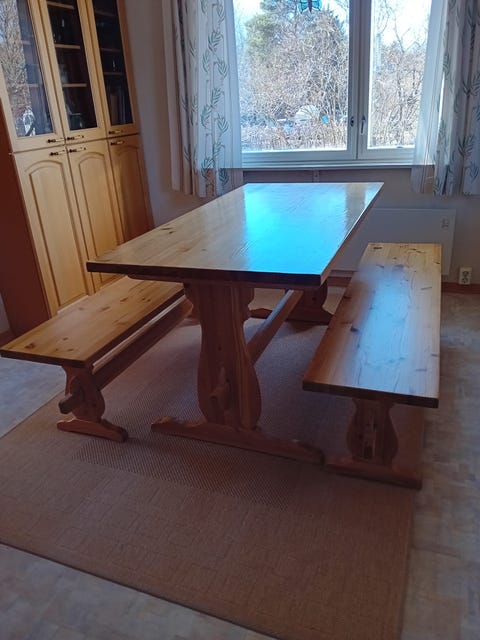 Pöytä, 2 pitkää penkkiä, 1 pieni penkki, koivua