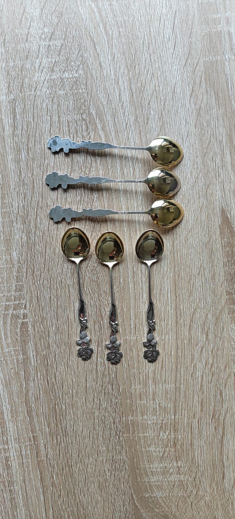 kukkakoristeiset (alpakka) jälkiruokalusikat kultaisella pesällä 6kpl