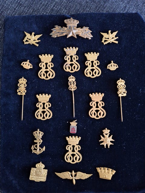 Kultasävyiset kuninkaalliset rintamerkit ja neulat kokoelma