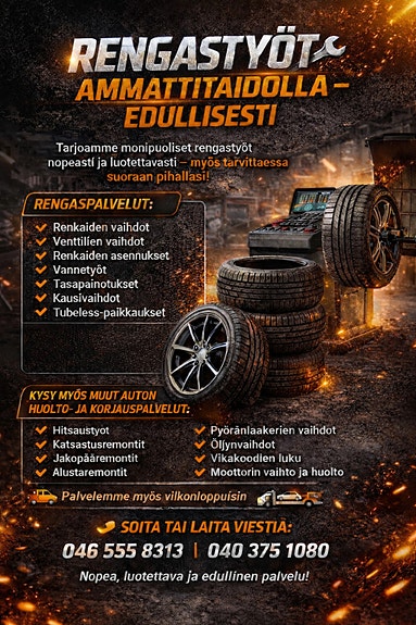40 €Renkaiden kausivaihdot +muut palvelutIisalmi, Iisalmi Keskus Pohjoinen, Pohjois-Savo9.4.Lisää suosikiksi.Avaa ilmoitus