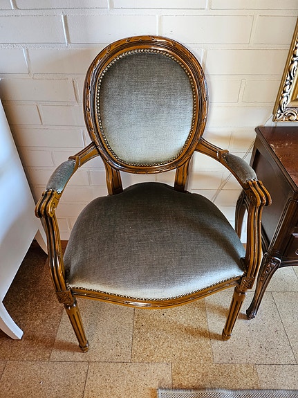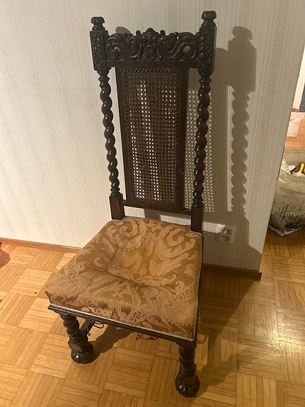 Antiikkituoli samettiverhoilulla ja puisella runkolla