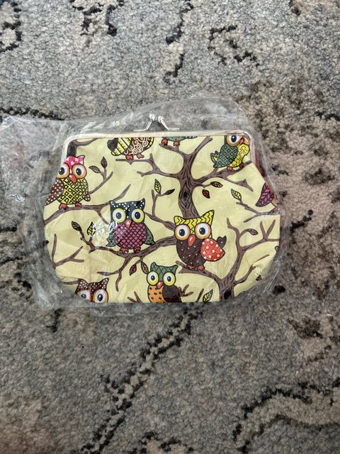 Violetti rahapussi kukkakuvioilla.