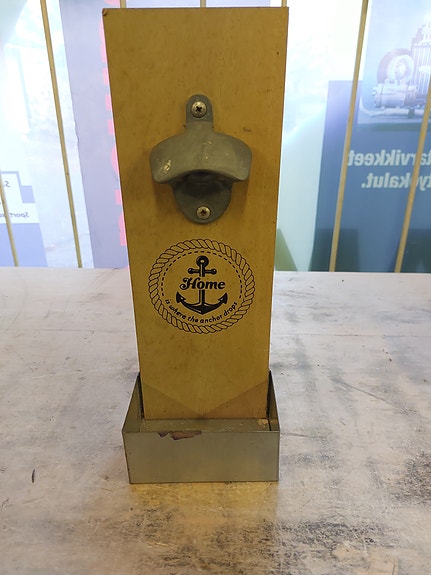 Seinään kiinnitettävä pullonavaaja metallilla ja puulla