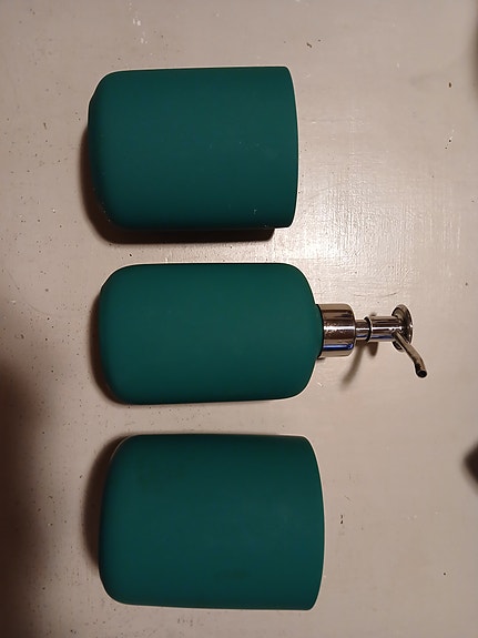 Ikea kylpyhuonesetti saippuapumppu ja säilytysastiat vihreä
