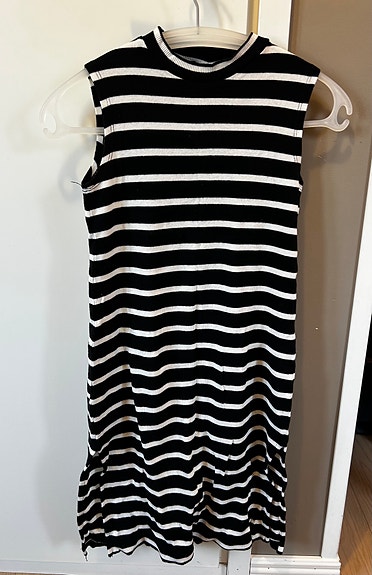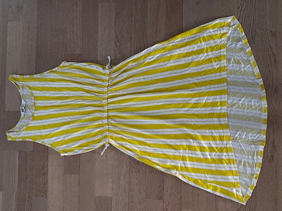 Pirteä H&M kelta/valkoraidallinen trikoomekko koko 158cm