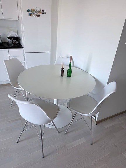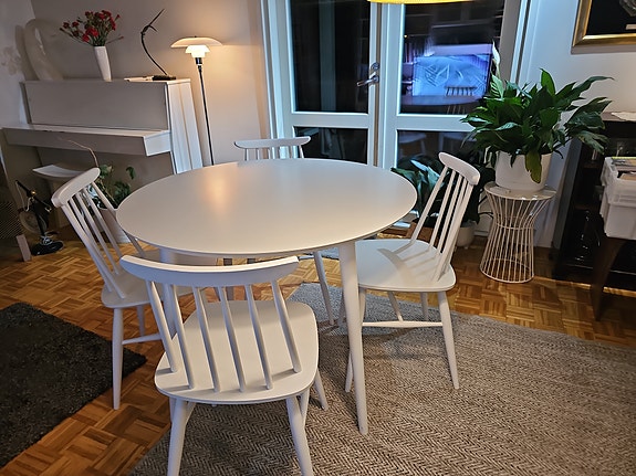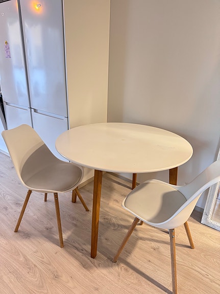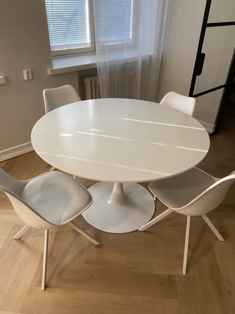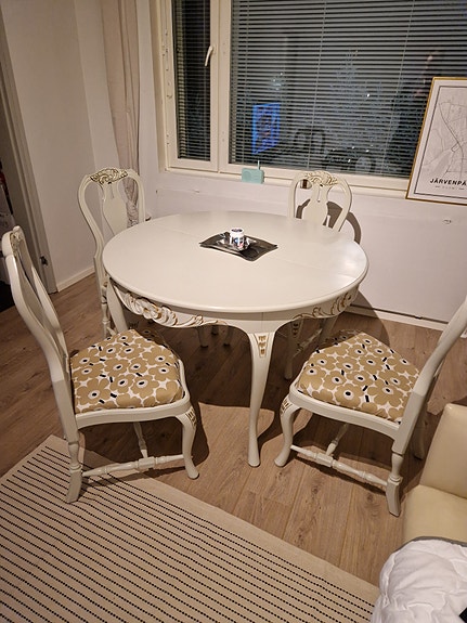 Valkoinen pyöreä keittiöpöytä ja neljä pinnatuolia, Vantaa/kuljetus