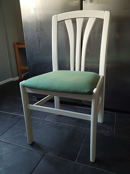 Valkoinen selkänojallinen tuoli vihreällä pehmusteella 2kpl (10€ kpl !!!!!!)