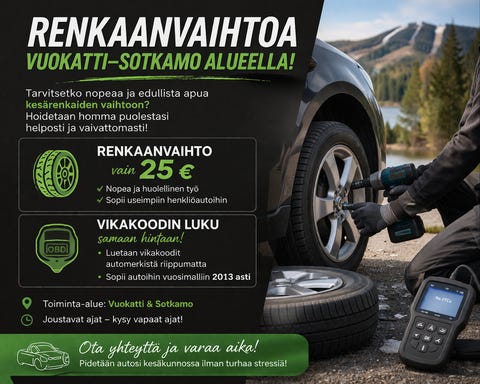 25 €Renkaanvaihtoa Vuokatti–Sotkamo alueella 🚗Sotkamo, Vuokatti, Kainuu8.4.Lisää suosikiksi.Avaa ilmoitus